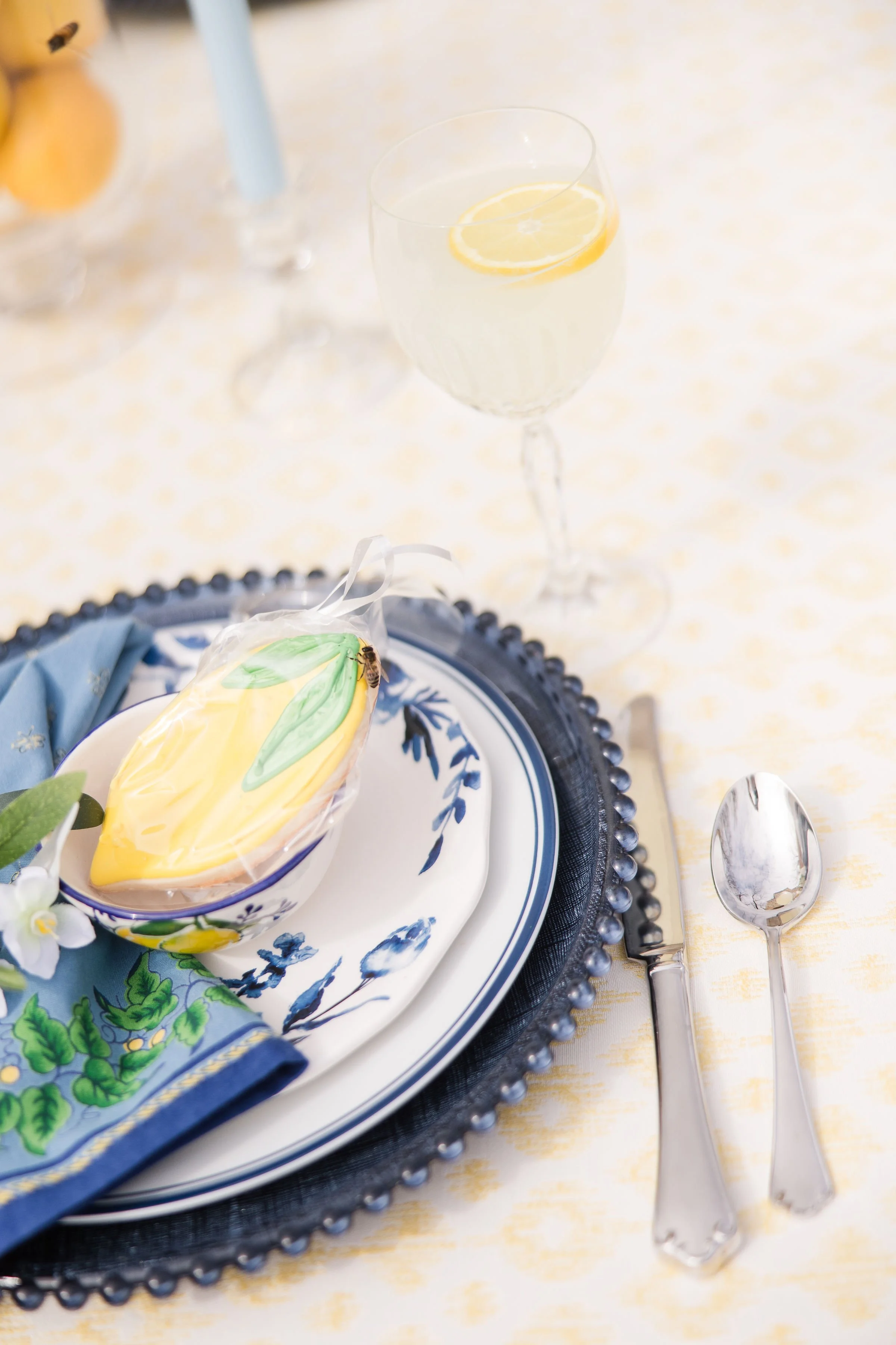 One of my favorite tablescapes to date. I especially like the citrine glassware and chargers; they really compliment the lemon vibe.